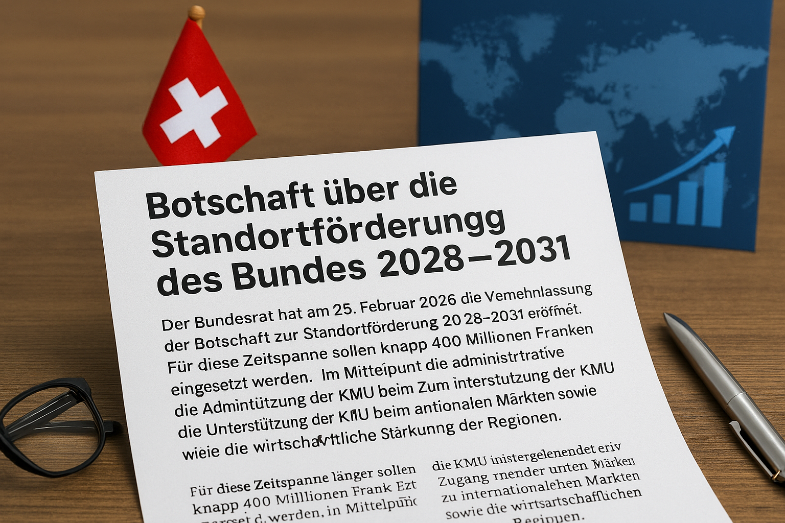 Der Bundesrat hat am 25. Februar 2026 die Vernehmlassung der Botschaft zur Standortförderung 2028–2031 eröffnet. Für diese Zeitspanne sollen knapp 400 Millionen Franken eingesetzt werden. Im Mittelpunkt stehen die administrative Entlastung der KMU, die Unterstützung der KMU beim Zugang zu internationalen Märkten sowie die wirtschaftliche Stärkung der Regionen.